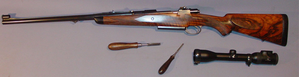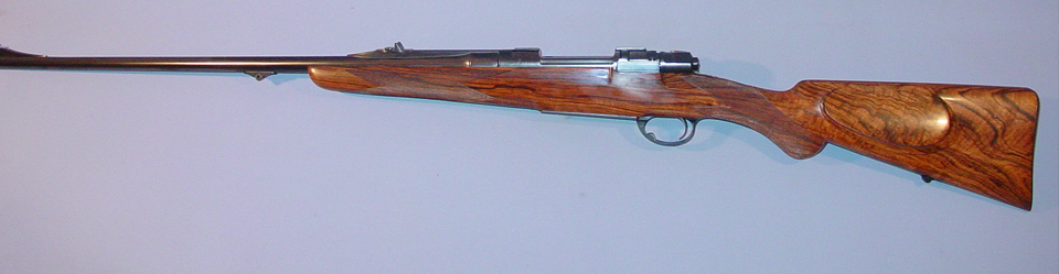 416 Rigby, GMA Magnum Action, Integral Barrel Work, Extended Tangs, Coffin Floorplate, Flat Top Checkering, Engraved by Roger Kehr.